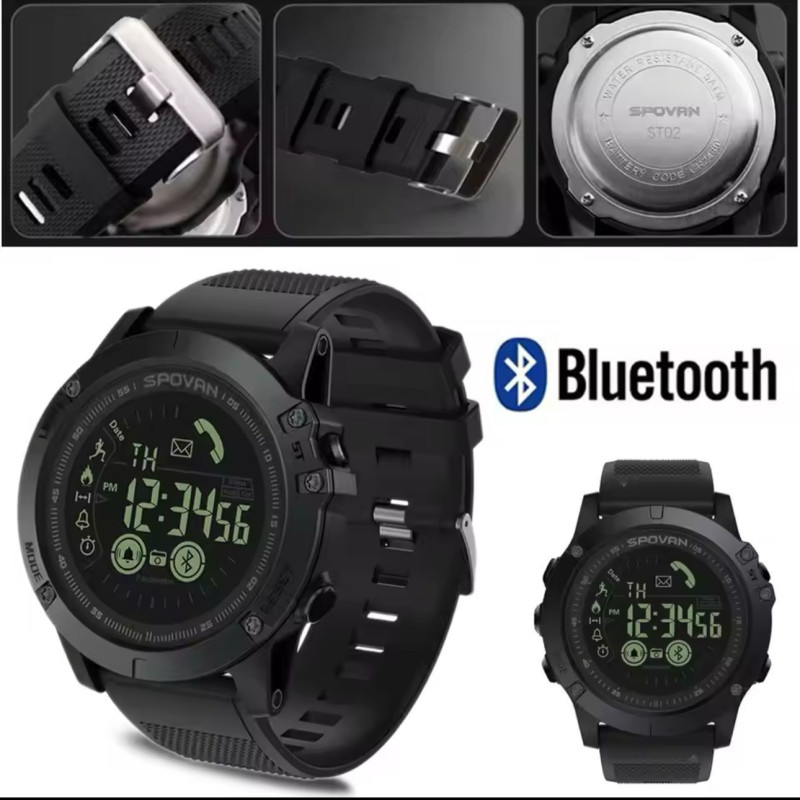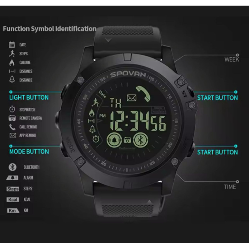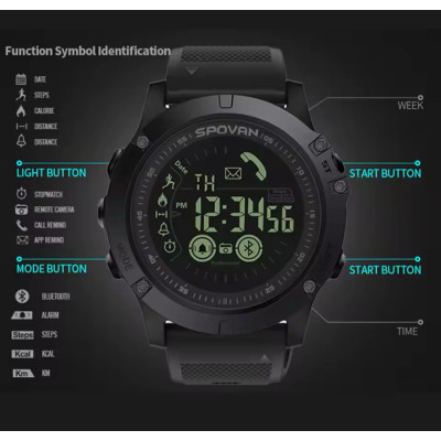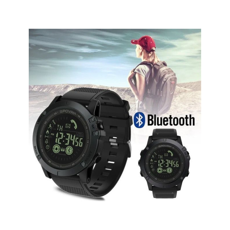 Spovan PR1 Tactical Watch – rugged smart watch with pedometer, sleep tracking, Bluetooth sync, and remote camera control. Scratch-resistant crystal and silicone strap for all-day comfort.